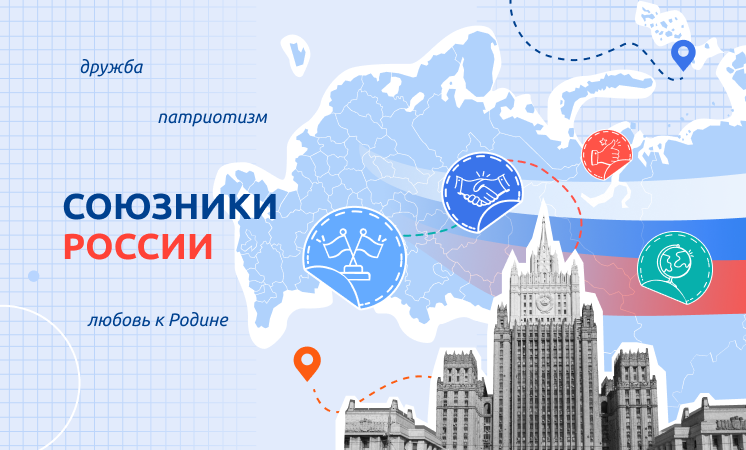 Основные смыслы: союзничество между государствами заключается в определении общих целей и взаимной поддержке в достижении этих целей: безопасность и благополучие людей. Взаимная поддержка помогает государствам повышать уровень жизни своих граждан, развивать торговлю и экономику, обмениваться знаниями и опытом в различных сферах жизни общества. Россия успешно развивает контакты с широким кругом иностранных государств.