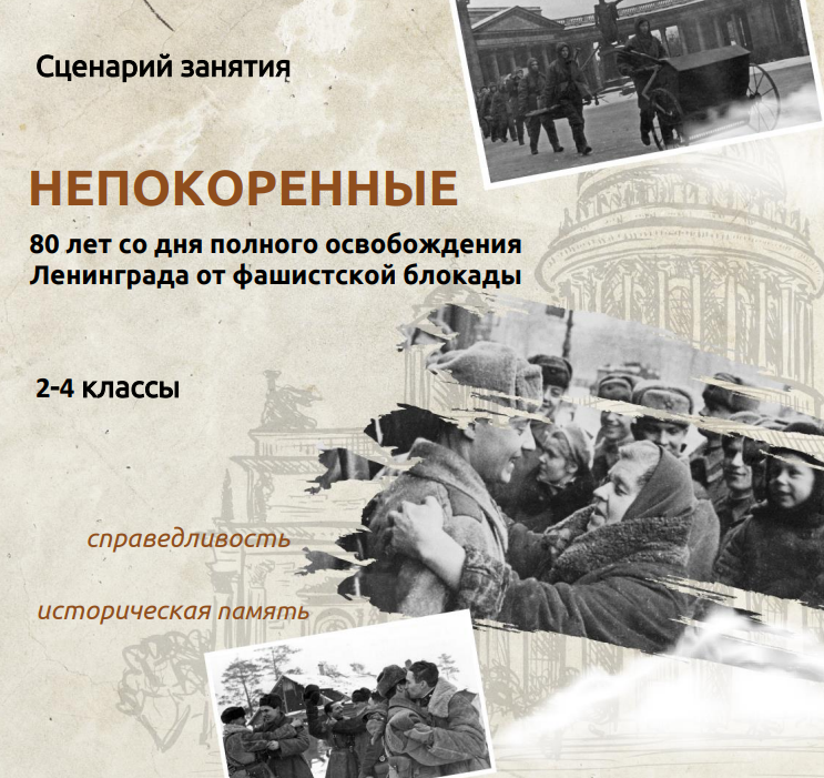 Разговор о событиях, происходивших во время блокады с 1941 по 1944 г., о труде, жизни взрослых и детей; система разнообразных заданий, обсуждение воображаемых ситуаций, строится на основе анализа сюжетов и оценки эмоционального состояния героев живописных полотен, написанных художниками-блокадниками Ленинграда. Особое внимание уделяется оценке труда подростков, которые на трудовом фронте заменяли своих родителей, воюющих отцов и дедов. Особо подчёркивается факт, что полторы тысячи подростков Северной столицы были награждены медалью «За оборону Ленинграда». Это позволяет участникам занятия наглядно представить и прочувствовать конкретные моменты жизни в блокадном городе.