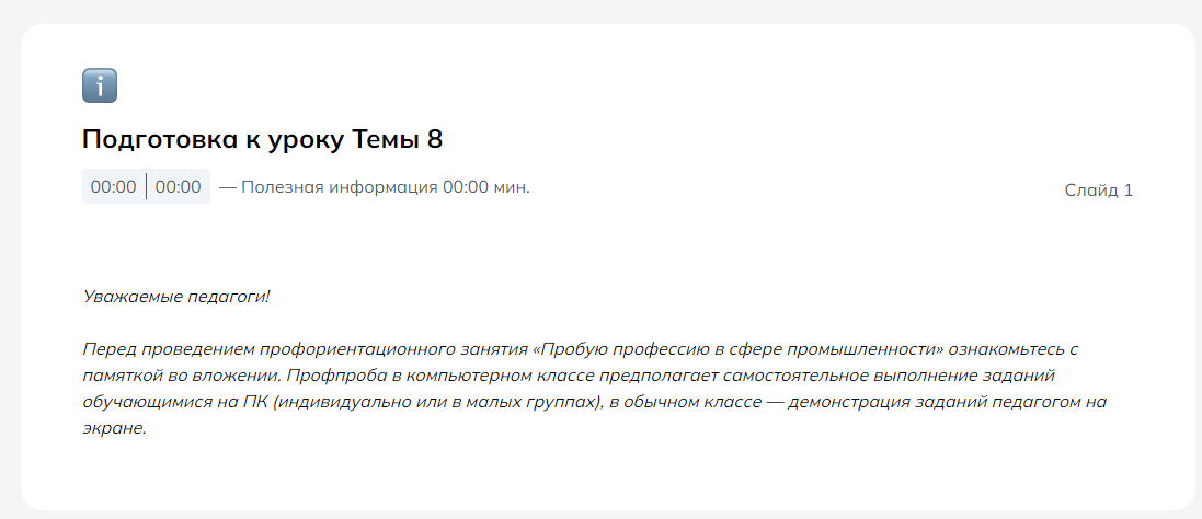 Перед проведением профориентационного занятия «Пробую профессию в сфере промышленности» ознакомьтесь с памяткой во вложении. Профпроба в компьютерном классе предполагает самостоятельное выполнение заданий обучающимися на ПК (индивидуально или в малых группах), в обычном классе — демонстрация заданий педагогом на экране.