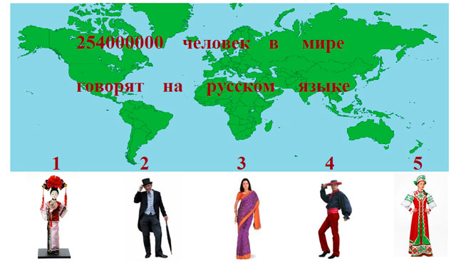 — Русский язык входит в число наиболее распространённых языков мира. На земле на нём говорят около 254 млн. человек. По степени распространённости русский язык занимает 5-е место в мире, уступая лишь китайскому, английскому, хинди, и испанскому.